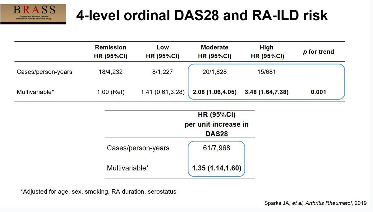 RT @richardPAconway Disease activity is a strong risk factor for RA-ILD. Particularly for moderate/high disease activity but there appears to be a linear relationship (at least above a certain threshold) #RNL26 https://t.co/ot8ttdmu5G