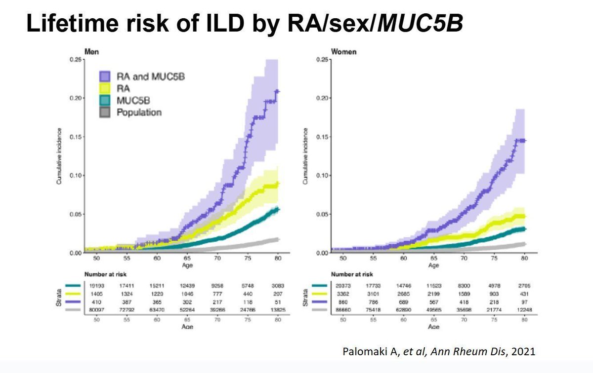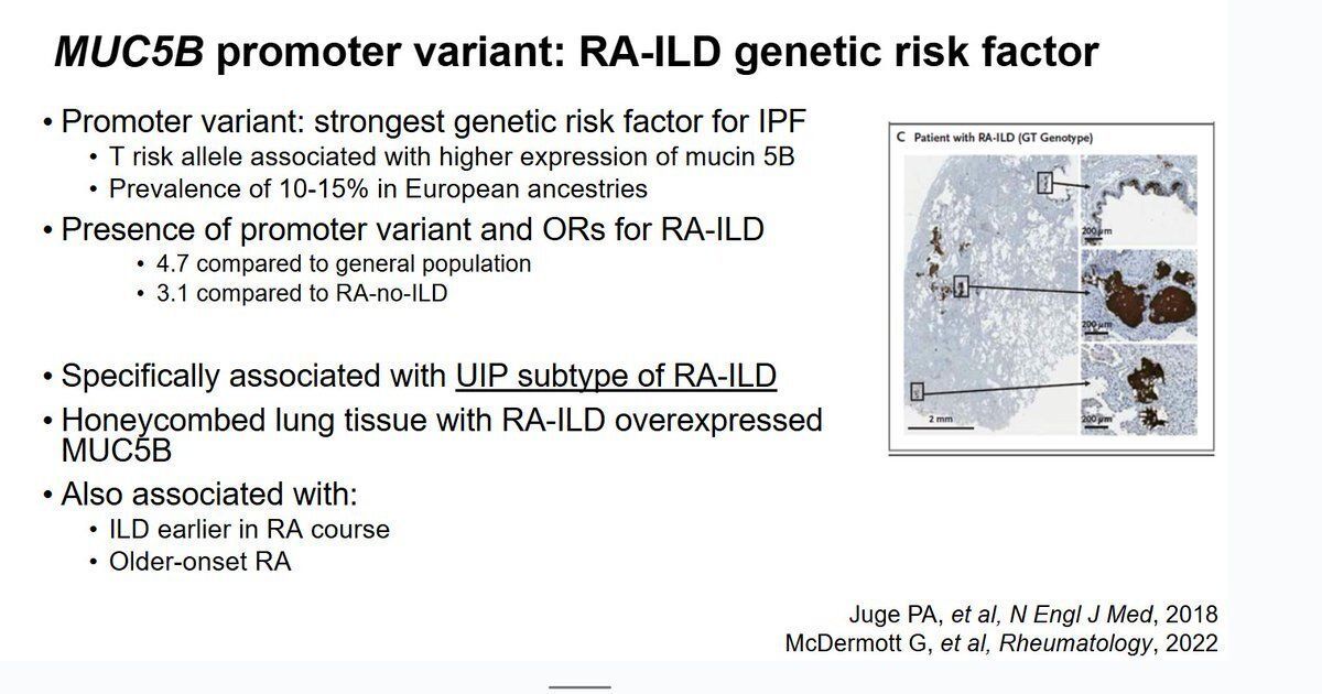 MUC5B is strong risk factor for RA-ILD. Specifically for UIP. Associated with both older-onset RA, and ILD earlier following RA presentation. #RNL26 https://t.co/qeLp1BqOEM