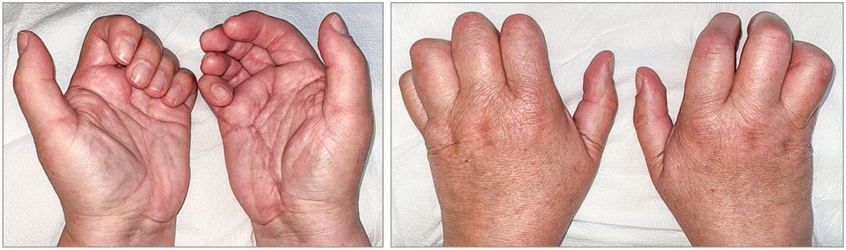 56-yoF w/ BL hand contractures, 15 mos BL hand pain/swelling/stiffness. No or partial relief w/ ibuprofen, 30 mg prednisone, MTX 10-20 mg/wk. All labs were normal. Whats the Dx? https://t.co/lZ0NHX5Y56 https://t.co/JC04E3JUxB