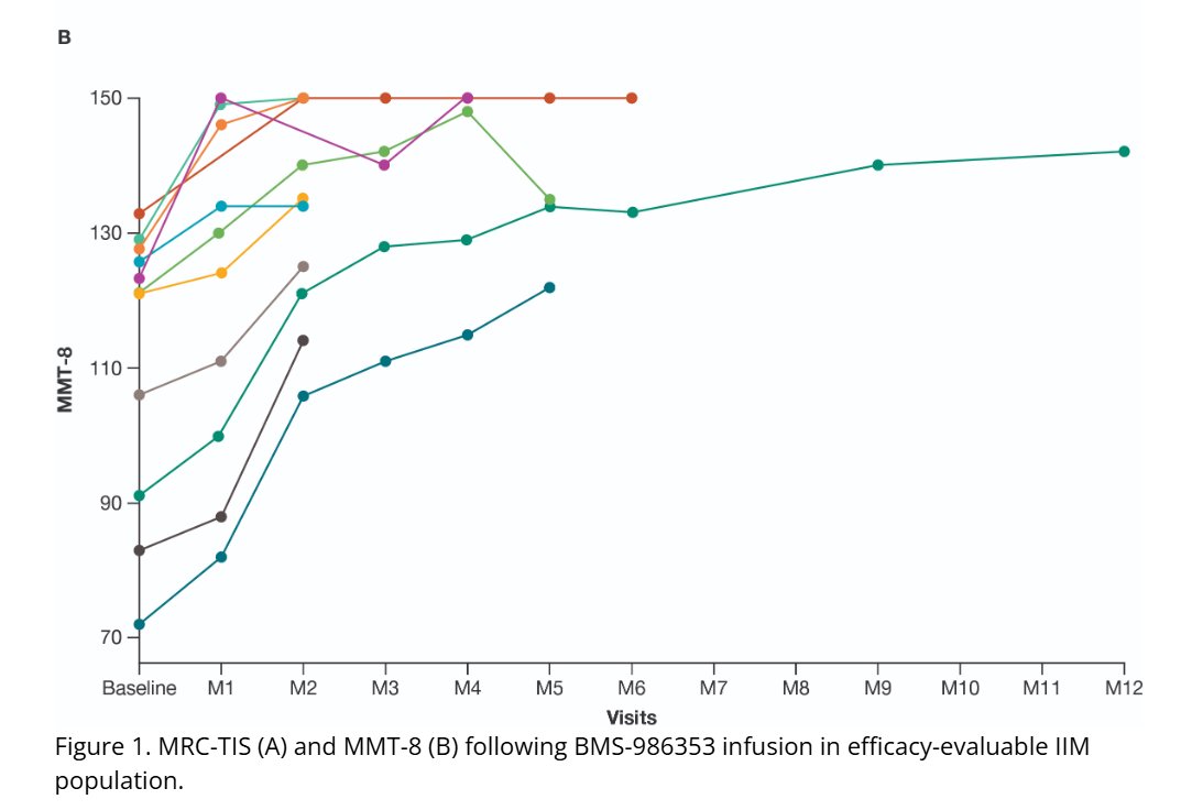 CAR T flex for myositis 💪 LB14: Ongoing Phase 1 CD19 CAR T in refractory myositis ✅ Well-tolerated (low-grade CRS, transient cytopenias) 📈 11/11 improved MMT-8 (median +22 Day 85, +27 Day 169) 🔹 10/11 off myositis therapy at follow-up @RheumNow #ACR25 https://t.co/btOsIcHe0f