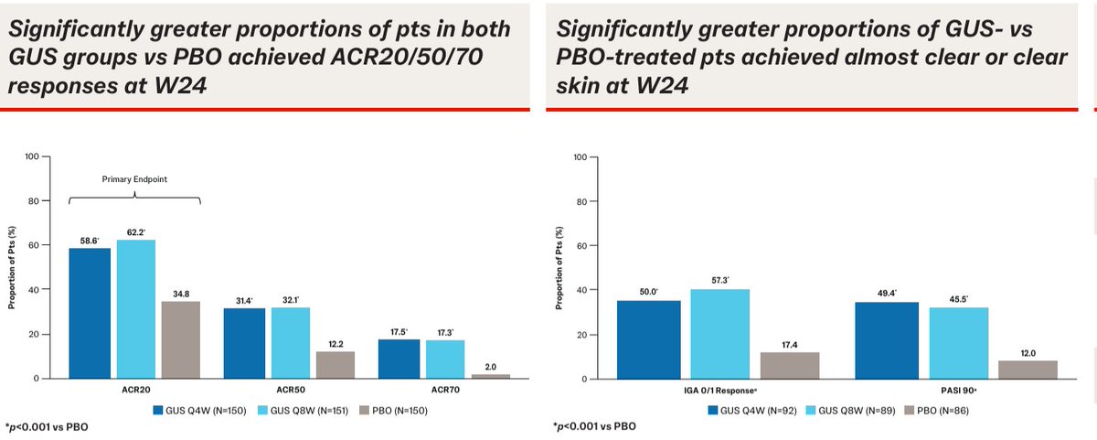 Ogdie et al. Week 24 results of SOLSTICE study. Guselkumab in TNF-IR in PsA. Good efficacy on skin and joint disease. No difference seen in Q4 vs Q8 weekly doses. @RheumNow #ACR25 Abstr#563 https://t.co/ztK0O9iKb8