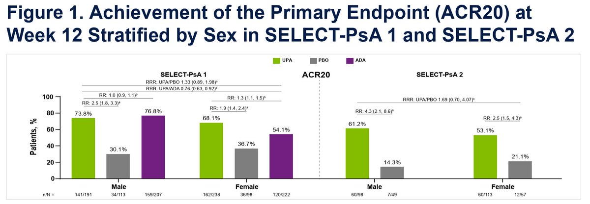 Novelli et al. Upadacitinib in male vs female PsA. Data from SELECT-PsA studies. Appears equivalent in males and females, contrasting with TNFi/IL17i data. @RheumNow #ACR25 Abstr#557 https://t.co/fMKsbCkju0
