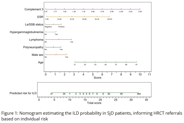 A new nomogram-based tool (AUC 0.8) predicts ILD risk using age, ESR, C3, hypergammaglobulinemia & anti-La/SSB.
