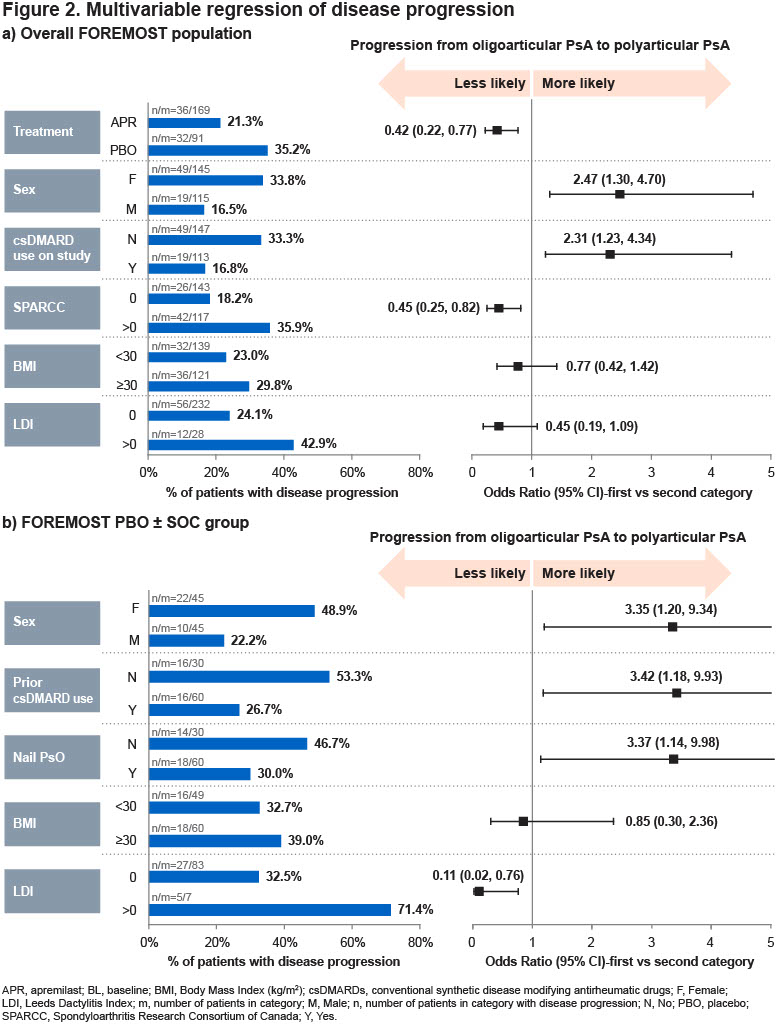 From the FOREMOST study factors predicting progression from oligo to polyarticular PsA: Female sex, enthesitis and dactylitis found to increase the risk of progression. Among patients in FOREMOST receiving PBO, prior csDMARD use was protective. Abstract#0576 @RheumNow #ACR25 https://t.co/CFMhAFgFBa