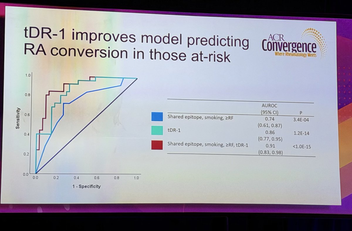 In 60 At-Risk CCP3+ people, Plasma tDR-1 improved prediction of RA. Need validation & adoption in practice @RheumNow https://t.co/XBmtohBEHc