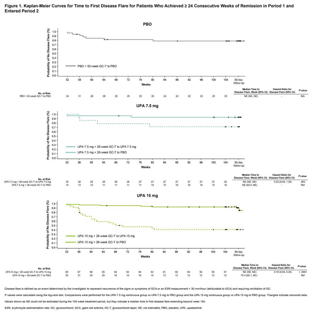 In the 2-yr SELECT-GCA trial, continued upadacitinib 15mg maintained remission in 69% vs 29% who switched to PBO, cutting flare risk by 90% and reducing steroid exposure by ~1g.