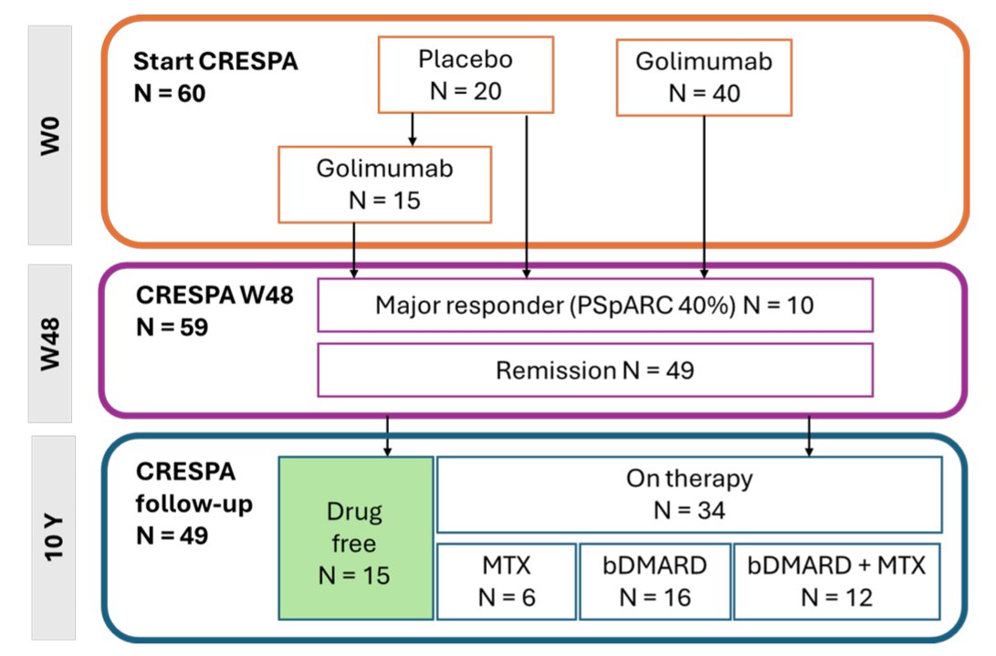 Damen et al. 10-year follow-up of CRESPA study. Treatment withdrawl trial in early peripheral SpA. 38% in drug free remission. 82% in remission. @RheumNow #ACR25 Abstr#568 https://t.co/KOVW5pSbJg