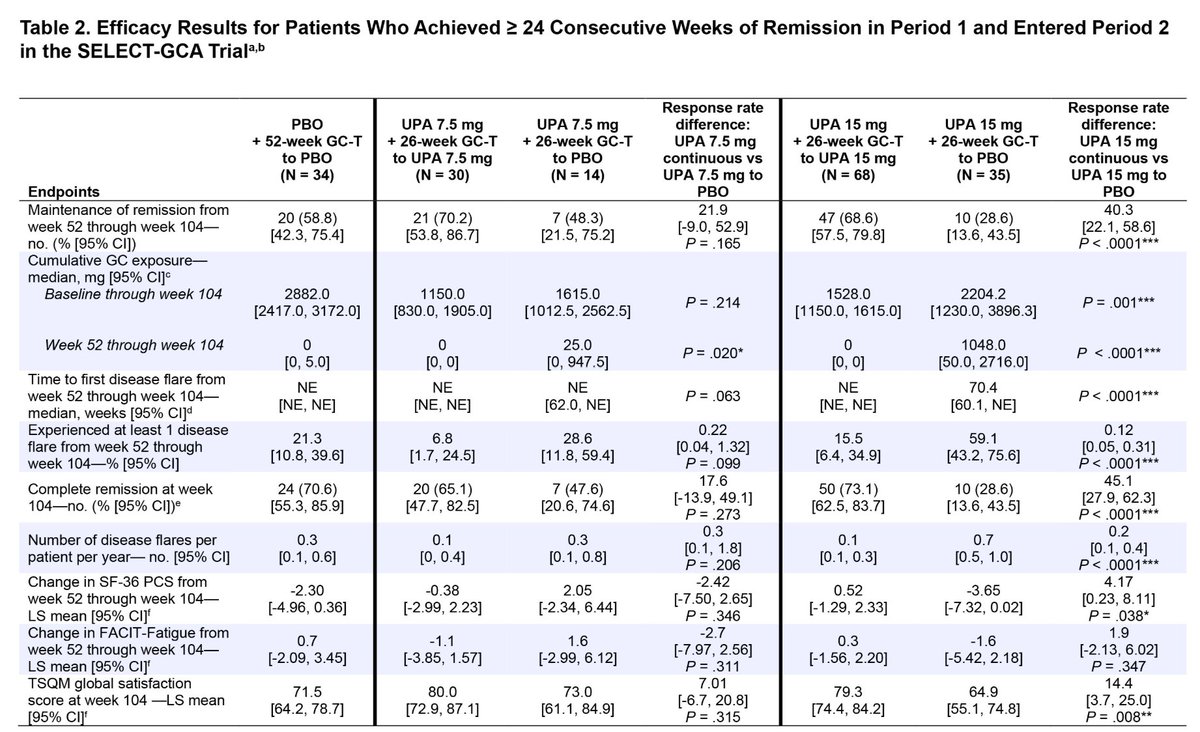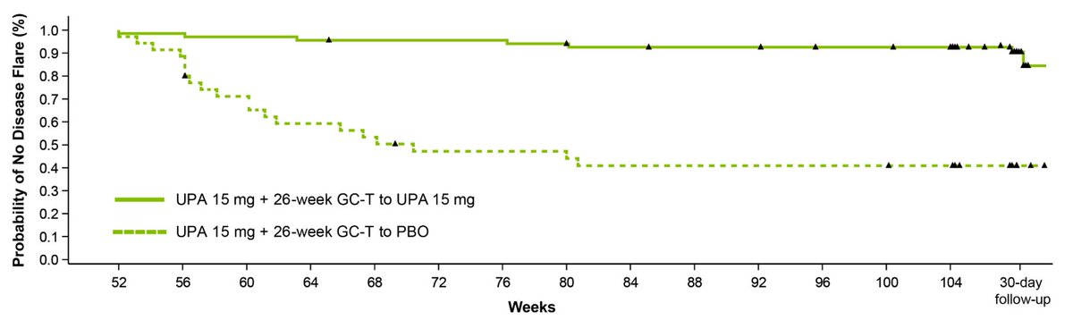 Schmidt et al. 2 year results of SELECT-GCA, upadacitinib in GCA. Remission 69% if upa continued vs 29% if stopped. 90% lower risk of flare, 1G less steroid @RheumNow