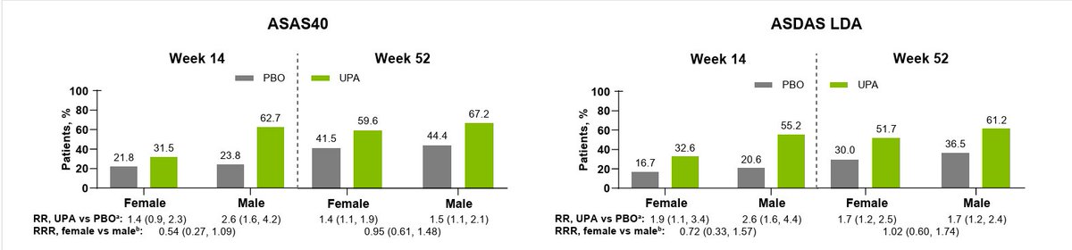 Ramiro et al. No significant differences seen between men and women in response to upadacitinib in AxSpA at week 14 or 52. Differs from data on TNFi/IL17i in this regard. Looks to me like men respond a bit quicker and better though... @RheumNow #ACR25 Abstr#589 https://t.co/2m7mrgcG0z