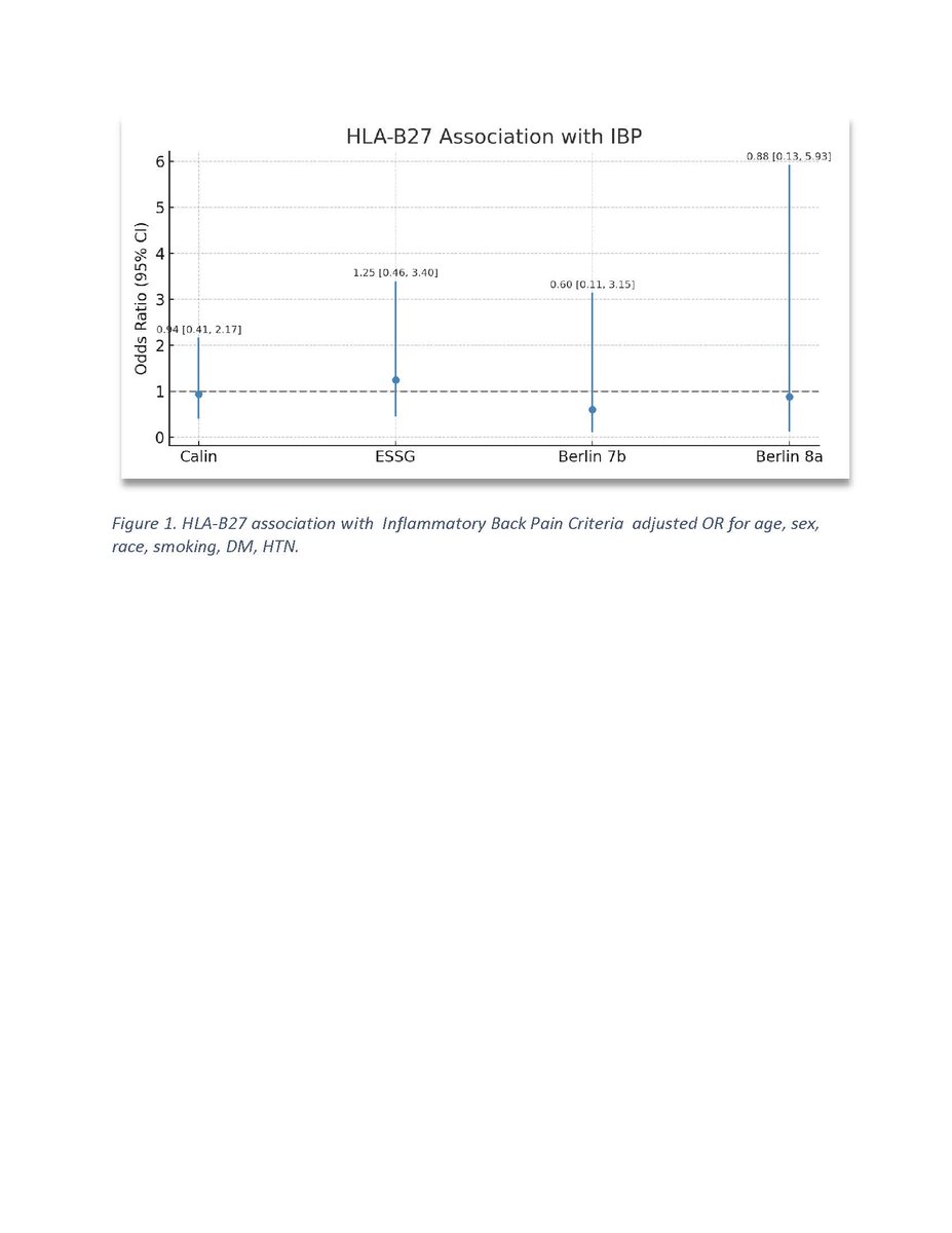 In a nationally representative NHANES sample, inflammatory back pain (IBP) was not associated with HLA-B27 positivity or elevated CRP, regardless of IBP criteria used (e.g., Berlin 8a: OR 0.88, p=0.876). IBP alone may be insufficient for identifying axSpA-related immunogenetic or https://t.co/82NjVU171z