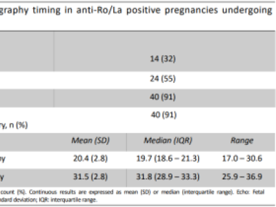 This single ctr retrospective cohort study by AOhayn on antiRo/La+ moms show that the mean timing of first fetal echo for CHB screening was at 20wks AOG.