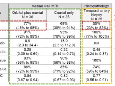 Rhee @RennieRhee et al. Combined cranial vessel wall and orbital MRI for GCA. Improves sensitivity 77% vs 69% with loss of specificity 91% vs 95%. Identifies abnormalities in some without visual symptoms - at risk of vision loss @RheumNow #ACR22 Abstr#1618 https://t.co/OtGm7sEWtU https://t.co/YM4WLahubH