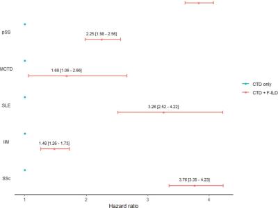 In >228k CTD patients across France, ILD increased mortality risk across all CTDs. Proportion of incident CTD with ILD highest in IIM (37%). Up to 34% of CTD-ILD pts had progressive pulm fibrosis. Supports earlier ILD screening & vigilance in CTDs.