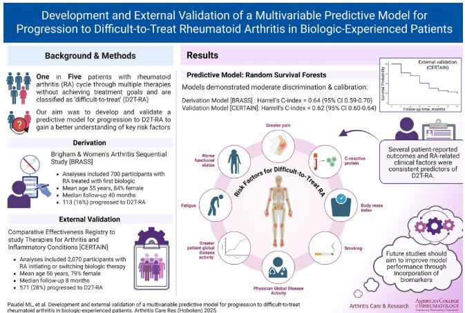 Prediction of D2T-RA. Model was trained on BRASS pts (700; 16% w/ D2T-RA) & validated on CERTAIN pts (2,070; 28% D2TRA). PRO's were strongest predictors. Moderate predictive accuracy (C-index of 0.64 & 0.62) w/ functional status, pain, fatigue, and global Dz activity https://t.co/uv3uGYIRFb
