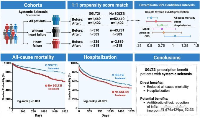 TriNetX retrospective cohort study of 1402 propensity matched Systemic Sclerosis pts on vs off SGLT2 inhib (2013-2025) & found SGLT2i significantly lowered all-cause mortality (HR 0.54), stroke (HR 0.64), & hospitalizations (HR 0.76), moreso in SSc without Hx of CHF (HR 0.62) https://t.co/t6GVrN6zoQ