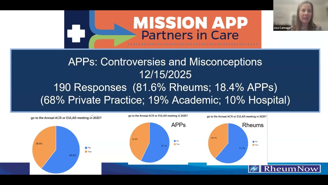 In this Tuesday Night Rheumatology, panelists discuss a range of topics, including APP roles and impact; models of care; independence; seeing new patients and complex cases; and more. Panelists: Daric A. Mueller, PA-C; Lisa Carnago, PhD, MSN, BSN, RN, FNP-C; Jack Cush, MD
